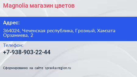 Magnolia, магазин цветов по адресу 364024, Чеченская республика, Грозный, Хамзата Орзамиева, 2 в дальнейшем Организация, размещена в следующих категориях: