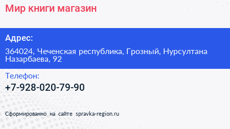 Мир книги, магазин по адресу 364024, Чеченская республика, Грозный, Нурсултана Назарбаева, 92 в дальнейшем Организация, размещена в следующих категориях: