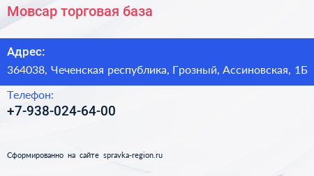 Мовсар, торговая база по адресу 364038, Чеченская республика, Грозный, Ассиновская, 1Б в дальнейшем Организация, размещена в следующих категориях: