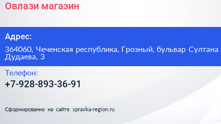 Овлази, магазин по адресу 364060, Чеченская республика, Грозный, бульвар Султана Дудаева, 3 в дальнейшем Организация, размещена в следующих категориях: