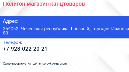 Полигон, магазин канцтоваров по адресу 364052, Чеченская республика, Грозный, Городок Иванова, 88 в дальнейшем Организация, размещена в следующих категориях: