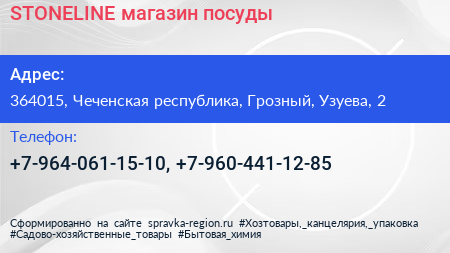 STONELINE, магазин посуды по адресу 364015, Чеченская республика, Грозный, Узуева, 2 в дальнейшем Организация, размещена в следующих категориях:
