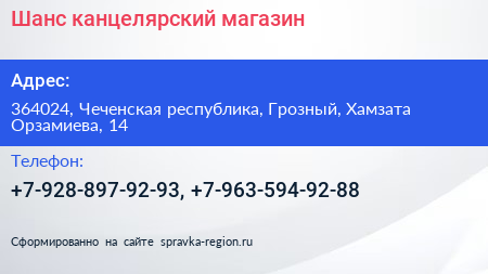 Шанс, канцелярский магазин по адресу 364024, Чеченская республика, Грозный, Хамзата Орзамиева, 14 в дальнейшем Организация, размещена в следующих категориях: