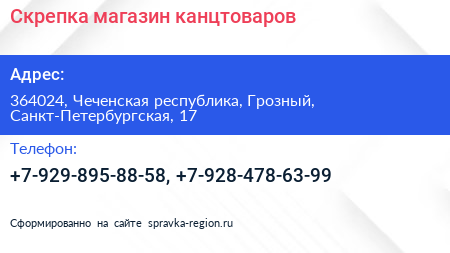 Скрепка, магазин канцтоваров по адресу 364024, Чеченская республика, Грозный, Санкт-Петербургская, 17 в дальнейшем Организация, размещена в следующих категориях: