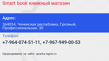 Smart book, книжный магазин по адресу 364014, Чеченская республика, Грозный, Профессиональная, 30 в дальнейшем Организация, размещена в следующих категориях:
