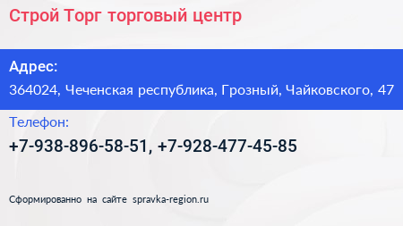 Строй Торг, торговый центр по адресу 364024, Чеченская республика, Грозный, Чайковского, 47 в дальнейшем Организация, размещена в следующих категориях:
