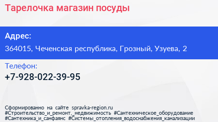 Тарелочка, магазин посуды по адресу 364015, Чеченская республика, Грозный, Узуева, 2 в дальнейшем Организация, размещена в следующих категориях: