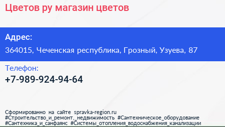 Цветов.ру, магазин цветов по адресу 364015, Чеченская республика, Грозный, Узуева, 87 в дальнейшем Организация, размещена в следующих категориях: