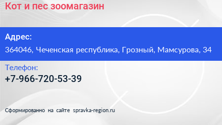 Кот и пес, зоомагазин по адресу 364046, Чеченская республика, Грозный, Мамсурова, 34 в дальнейшем Организация, размещена в следующих категориях:
