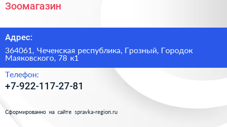 Зоомагазин по адресу 364061, Чеченская республика, Грозный, Городок Маяковского, 78 к1 в дальнейшем Организация, размещена в следующих категориях: