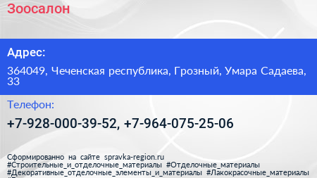 Зоосалон по адресу 364049, Чеченская республика, Грозный, Умара Садаева, 33 в дальнейшем Организация, размещена в следующих категориях: