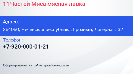 11 Частей Мяса, мясная лавка по адресу 364060, Чеченская республика, Грозный, Лагерная, 32 в дальнейшем Организация, размещена в следующих категориях: