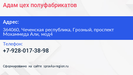 Адам, цех полуфабрикатов по адресу 364060, Чеченская республика, Грозный, проспект Мохаммеда Али, мод4 в дальнейшем Организация, размещена в следующих категориях: