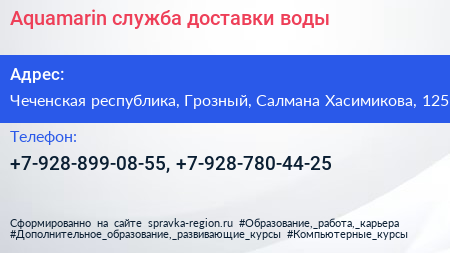 Aquamarin, служба доставки воды по адресу Чеченская республика, Грозный, Салмана Хасимикова, 125 в дальнейшем Организация, размещена в следующих категориях: