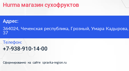 Hurma, магазин сухофруктов по адресу 364024, Чеченская республика, Грозный, Умара Кадырова, 37 в дальнейшем Организация, размещена в следующих категориях: