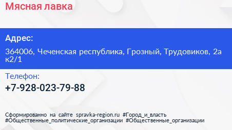 Мясная лавка по адресу 364006, Чеченская республика, Грозный, Трудовиков, 2а к2/1 в дальнейшем Организация, размещена в следующих категориях: