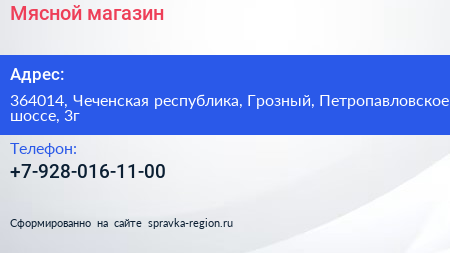 Мясной магазин по адресу 364014, Чеченская республика, Грозный, Петропавловское шоссе, 3г в дальнейшем Организация, размещена в следующих категориях: