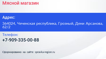 Мясной магазин по адресу 364024, Чеченская республика, Грозный, Дени Арсанова, 62/2 в дальнейшем Организация, размещена в следующих категориях: