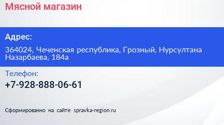 Мясной магазин по адресу 364024, Чеченская республика, Грозный, Нурсултана Назарбаева, 184а в дальнейшем Организация, размещена в следующих категориях: