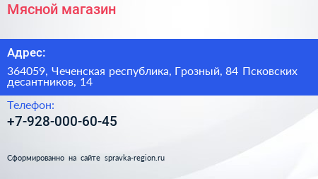 Мясной магазин по адресу 364059, Чеченская республика, Грозный, 84 Псковских десантников, 14 в дальнейшем Организация, размещена в следующих категориях: