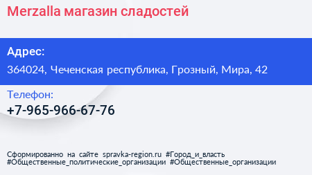 Merzalla, магазин сладостей по адресу 364024, Чеченская республика, Грозный, Мира, 42 в дальнейшем Организация, размещена в следующих категориях: