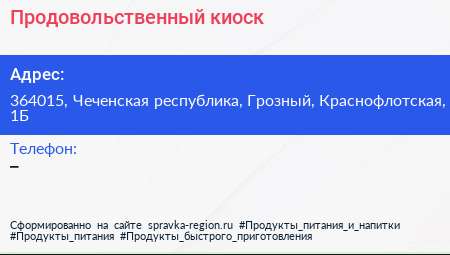 Продовольственный киоск по адресу 364015, Чеченская республика, Грозный, Краснофлотская, 1Б в дальнейшем Организация, размещена в следующих категориях: