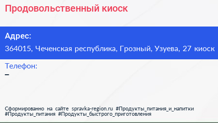 Продовольственный киоск по адресу 364015, Чеченская республика, Грозный, Узуева, 27 киоск в дальнейшем Организация, размещена в следующих категориях: