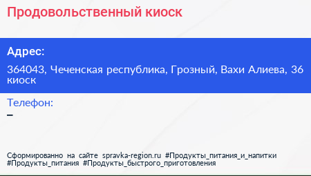 Продовольственный киоск по адресу 364043, Чеченская республика, Грозный, Вахи Алиева, 36 киоск в дальнейшем Организация, размещена в следующих категориях: