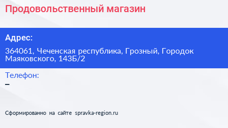 Продовольственный магазин по адресу 364061, Чеченская республика, Грозный, Городок Маяковского, 143Б/2 в дальнейшем Организация, размещена в следующих категориях: