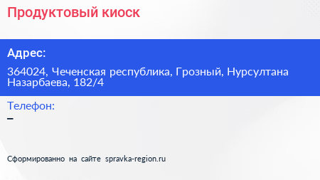 Продуктовый киоск по адресу 364024, Чеченская республика, Грозный, Нурсултана Назарбаева, 182/4 в дальнейшем Организация, размещена в следующих категориях: