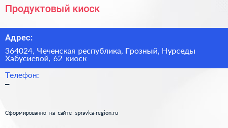 Продуктовый киоск по адресу 364024, Чеченская республика, Грозный, Нурседы Хабусиевой, 62 киоск в дальнейшем Организация, размещена в следующих категориях: