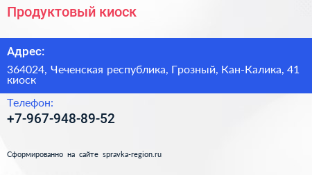 Продуктовый киоск по адресу 364024, Чеченская республика, Грозный, Кан-Калика, 41 киоск в дальнейшем Организация, размещена в следующих категориях: