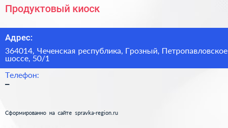 Продуктовый киоск по адресу 364014, Чеченская республика, Грозный, Петропавловское шоссе, 50/1 в дальнейшем Организация, размещена в следующих категориях: