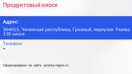 Продуктовый киоск по адресу 364015, Чеченская республика, Грозный, переулок Узуева, 138 киоск в дальнейшем Организация, размещена в следующих категориях: