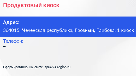 Продуктовый киоск по адресу 364015, Чеченская республика, Грозный, Гаибова, 1 киоск в дальнейшем Организация, размещена в следующих категориях: