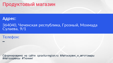 Продуктовый магазин по адресу 364040, Чеченская республика, Грозный, Мохмада Сулаева, 9/1 в дальнейшем Организация, размещена в следующих категориях: