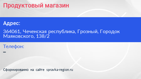 Продуктовый магазин по адресу 364061, Чеченская республика, Грозный, Городок Маяковского, 138/2 в дальнейшем Организация, размещена в следующих категориях: