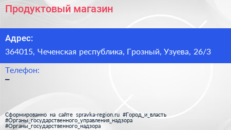 Продуктовый магазин по адресу 364015, Чеченская республика, Грозный, Узуева, 26/3 в дальнейшем Организация, размещена в следующих категориях: