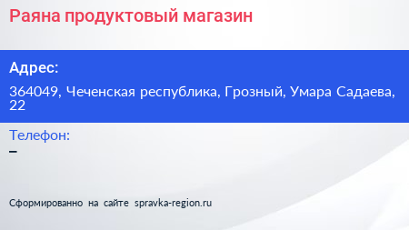 Раяна, продуктовый магазин по адресу 364049, Чеченская республика, Грозный, Умара Садаева, 22 в дальнейшем Организация, размещена в следующих категориях: