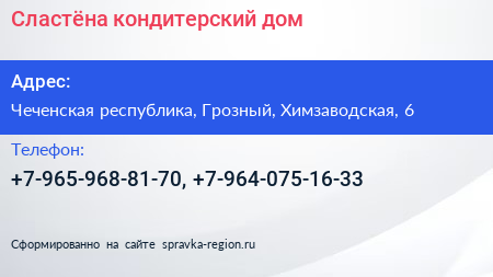 Сластёна, кондитерский дом по адресу Чеченская республика, Грозный, Химзаводская, 6 в дальнейшем Организация, размещена в следующих категориях: