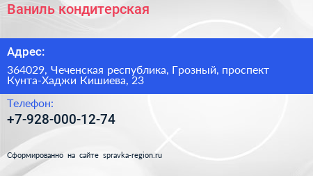 Ваниль, кондитерская по адресу 364029, Чеченская республика, Грозный, проспект Кунта-Хаджи Кишиева, 23 в дальнейшем Организация, размещена в следующих категориях: