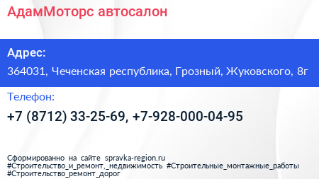 АдамМоторс, автосалон по адресу 364031, Чеченская республика, Грозный, Жуковского, 8г в дальнейшем Организация, размещена в следующих категориях: