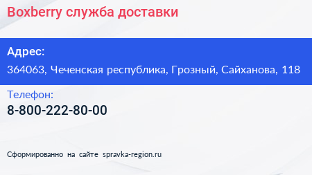 Boxberry, служба доставки по адресу 364063, Чеченская республика, Грозный, Сайханова, 118 в дальнейшем Организация, размещена в следующих категориях: