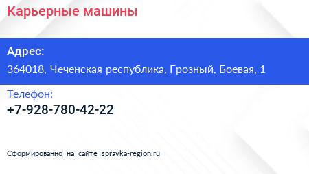 Карьерные машины по адресу 364018, Чеченская республика, Грозный, Боевая, 1 в дальнейшем Организация, размещена в следующих категориях: