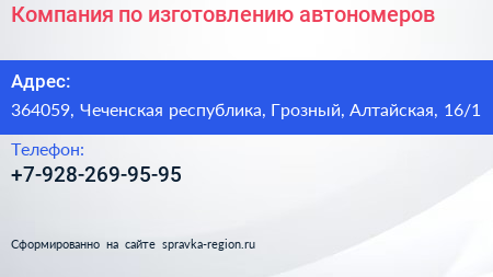 Компания по изготовлению автономеров по адресу 364059, Чеченская республика, Грозный, Алтайская, 16/1 в дальнейшем Организация, размещена в следующих категориях: