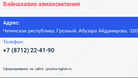 Вайнахавиа, авиакомпания по адресу Чеченская республика, Грозный, Абузара Айдамирова, 320 в дальнейшем Организация, размещена в следующих категориях: