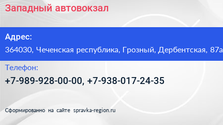 Западный, автовокзал по адресу 364030, Чеченская республика, Грозный, Дербентская, 87а в дальнейшем Организация, размещена в следующих категориях: