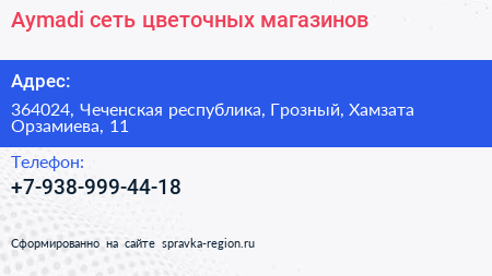 Aymadi, сеть цветочных магазинов по адресу 364024, Чеченская республика, Грозный, Хамзата Орзамиева, 11 в дальнейшем Организация, размещена в следующих категориях: