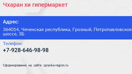 Чхаран-хи, гипермаркет по адресу 364014, Чеченская республика, Грозный, Петропавловское шоссе, 3Б в дальнейшем Организация, размещена в следующих категориях: