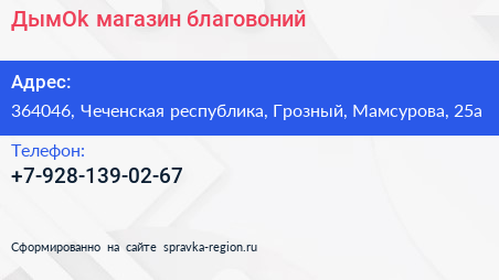 ДымOk, магазин благовоний по адресу 364046, Чеченская республика, Грозный, Мамсурова, 25а в дальнейшем Организация, размещена в следующих категориях: